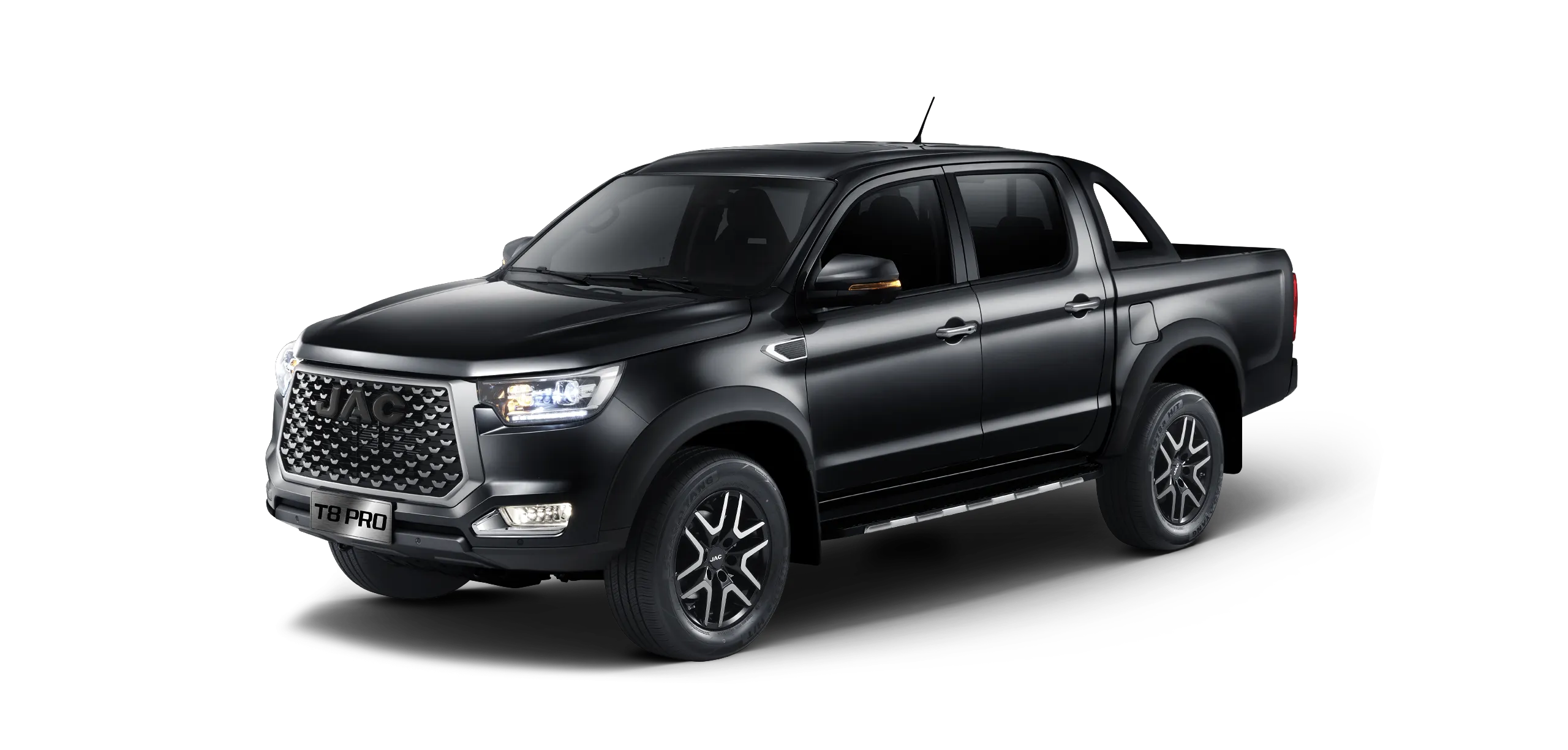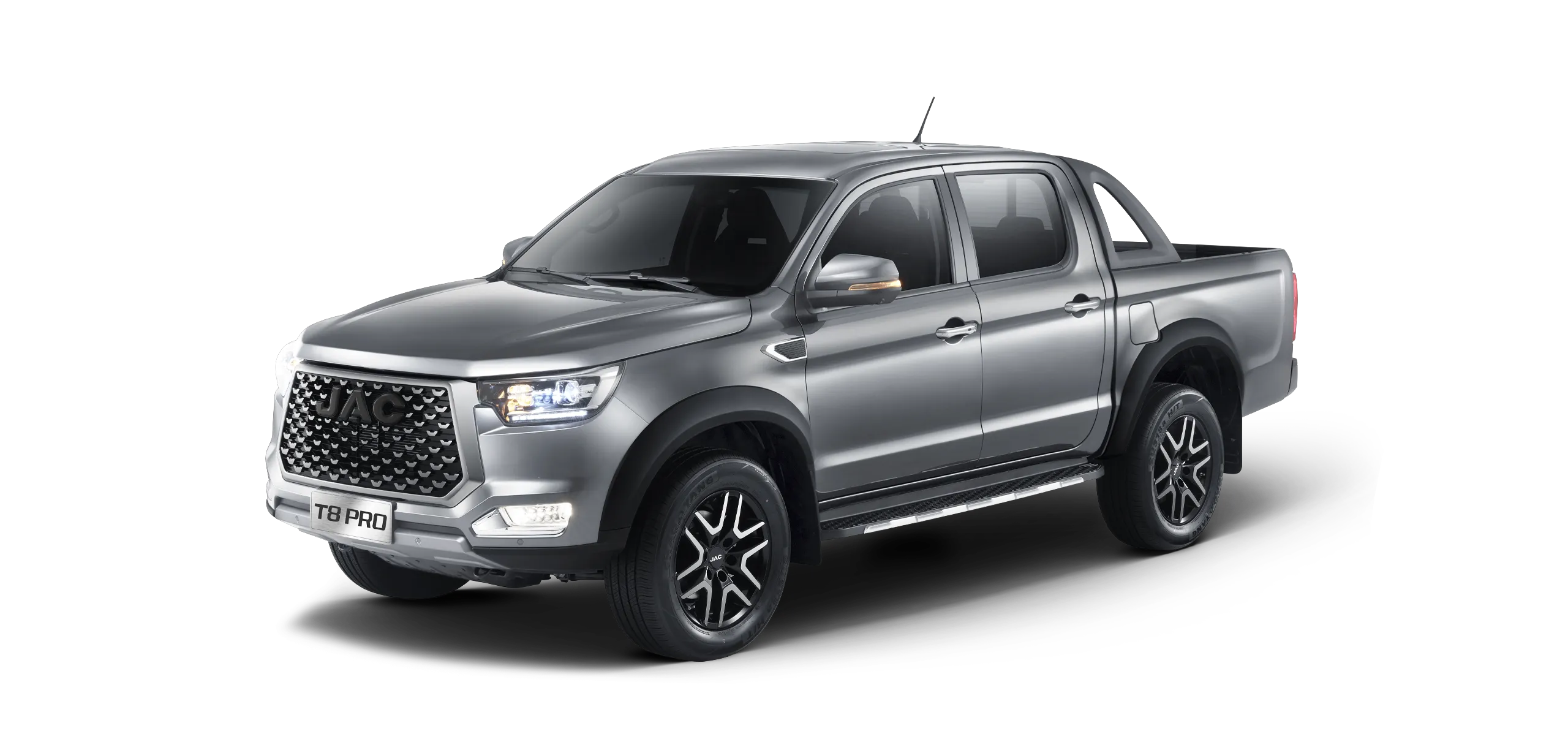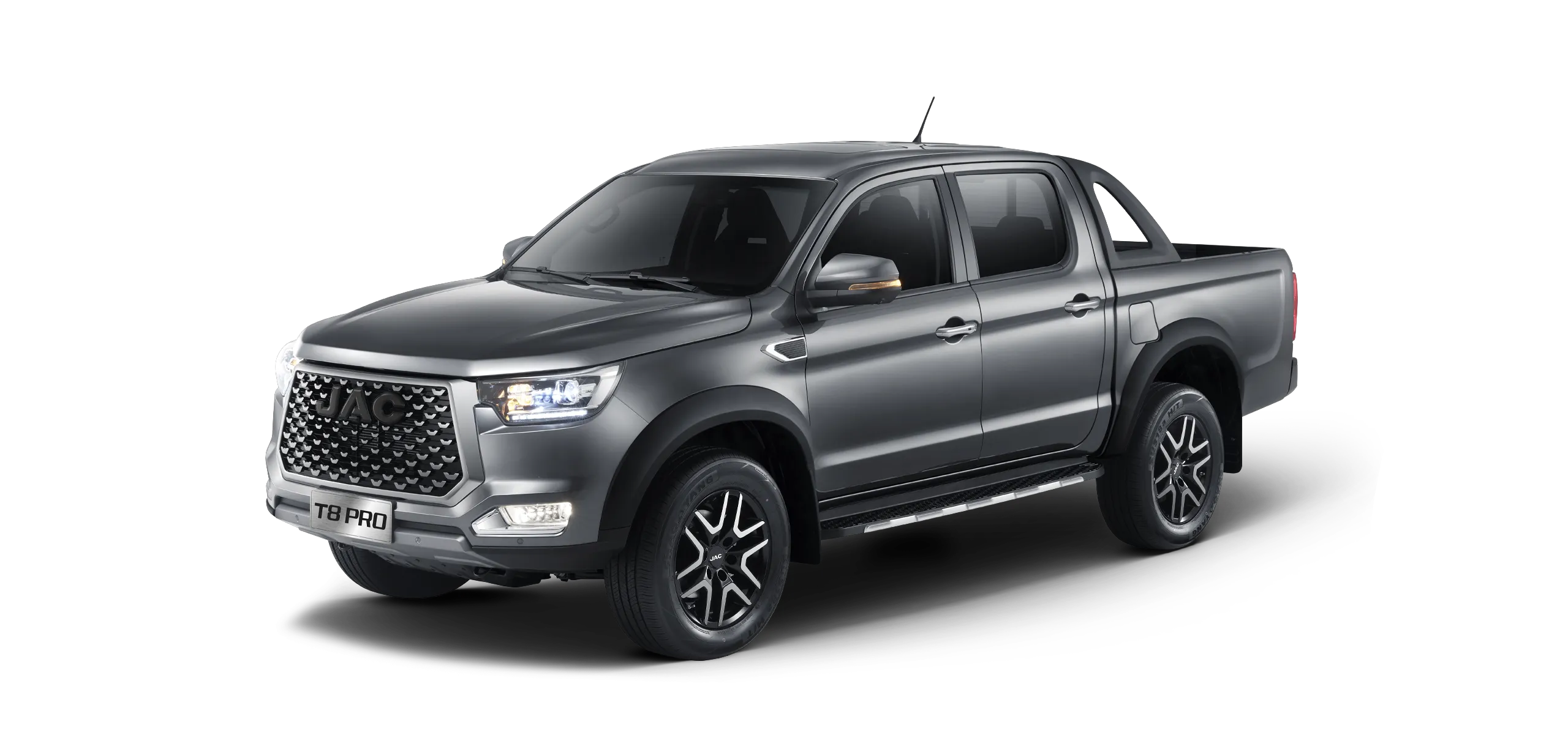 JAC T8 Pro to pick-up stworzony dla kierowców oczekujących funkcjonalności i wyrazistego stylu. Muskularna sylwetka i solidne proporcje nadają mu potężny charakter, a masywny zderzak i światła LED podkreślają nowoczesne DNA. Dynamiczne linie nadwozia łączą estetykę z aerodynamiką, dzięki czemu auto wygląda efektownie i pewnie prowadzi się w każdych warunkach. T8 Pro wyróżnia się zarówno w mieście, jak i na wymagających trasach terenowych, dając poczucie bezpieczeństwa i inspirując do odkrywania nowych przygód.
